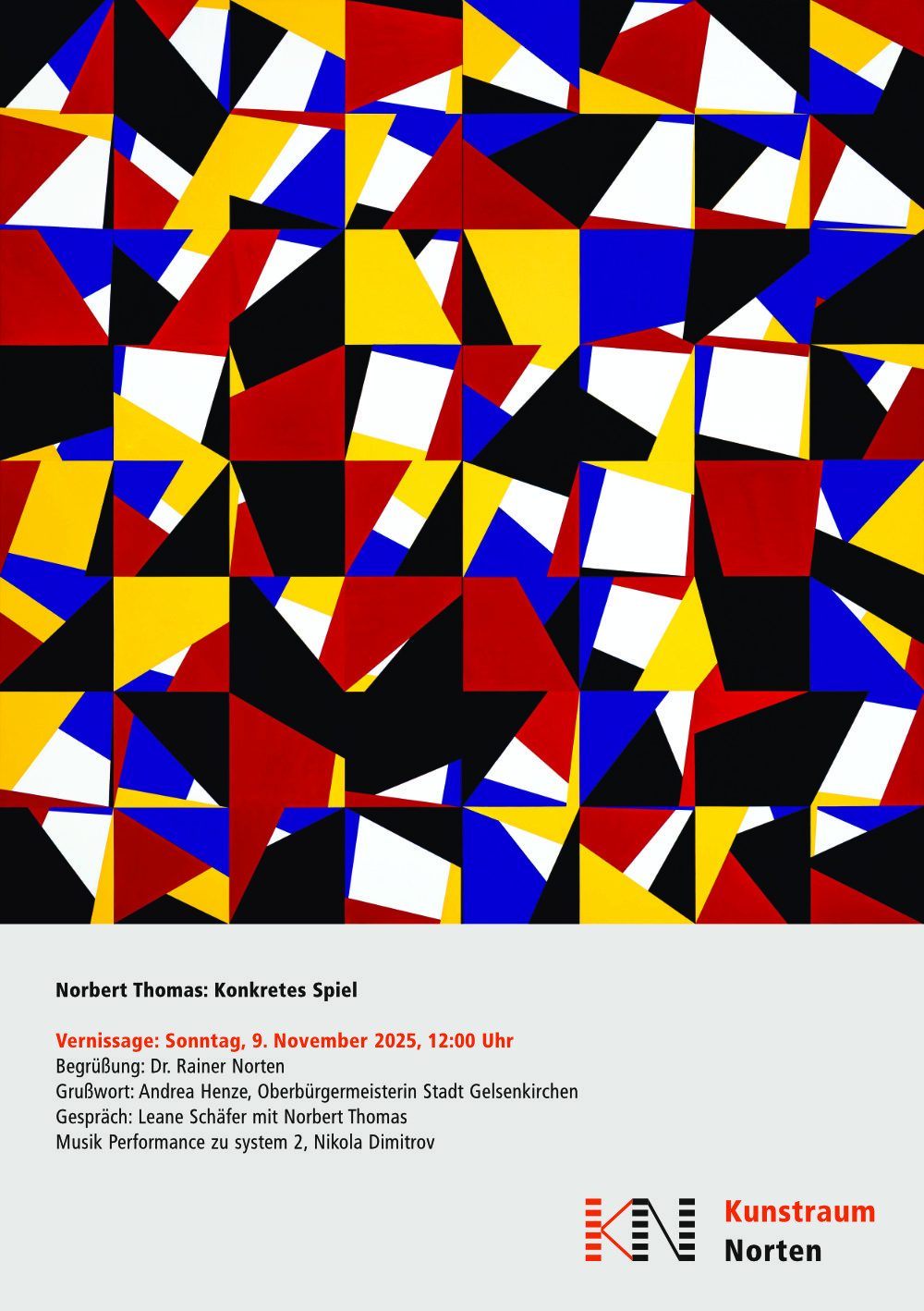 Der Essener Künstler Norbert Thomas steht in der Tradition der Konkreten Kunst, die er seit über 50 Jahren auf eigenständige Weise immer wieder neu in verschiedenen Werkreihen interpretiert. Thomas konzentrierte sich von Anfang an auf die objektivierende Gestaltung der Relation von Form und Farbe. Seit den 1970er Jahren untersucht er in einer vertikal-horizontalen Grundordnung mit Hilfe des „gelenkten Zufalls“ das Verhalten geometrischer Elemente zueinander. Es geht in seiner Arbeit um die Verbindung von System und Zufall und um neue Formen der Wahrnehmung. Das für den Kunstring Folkwang geschaffene Wandrelief „system-2“ aus weiß beschichtetem Plexiglas und der zugehörige zweifarbige Siebdruck sind dabei zwei Seiten einer Medaille und Teil einer sich bei Thomas beständig fortschreibenden methodischen Strukturveränderung. Die weißen bzw. schwarzen Formen werden dabei durch die Farbe Neon-Orange in einen Schwebezustand versetzt: Beim von der Wand leicht abstehenden Relief durch die Einfärbung der Rückseite und beim Siebdruck durch eine farbige Umrandung des tiefschwarz gedruckten Linienrasters. In beiden Fällen erzeugt der Lichtschein den Eindruck von Immaterialität, welche einer eher strengen Rasterästhetik geometriebasierter Kunst auf erfrischende Weise zuwiderläuft.
